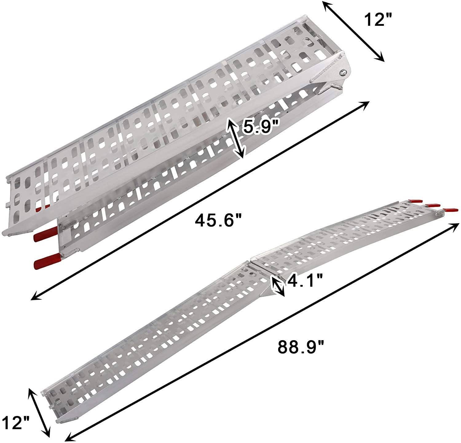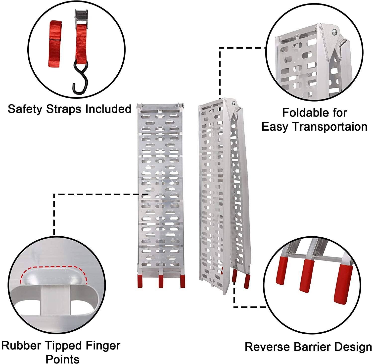 Made of high-strength and lightweight aluminum makes the loading ramp more robust, durable and anti-rust. Easy to handle loads up to 1500 lbs.Just unfold it and ready to use. No installation required. Easy to lock up to truck bed. The folded ramp is only 45.6 inches will fit in most back seats for easy carry and easy storage.Rubber-coated fingers prevents slipping and provides more traction while protects your tailgate from scratches. Includes 2 adjustable safety straps to improve safety and keep the ramps firmly attached to the tailgateArched design provides better clearance and traction, ensuring a smooth lift every time which meaning you can set up heavy loads without worrying about slippageSuitable for Motorcycle/Dirt Bike/Trailer/ATV/UTV/Garden Tractor/Lawn Mower/Golf Cart/Snow Blower.etc.Specification: