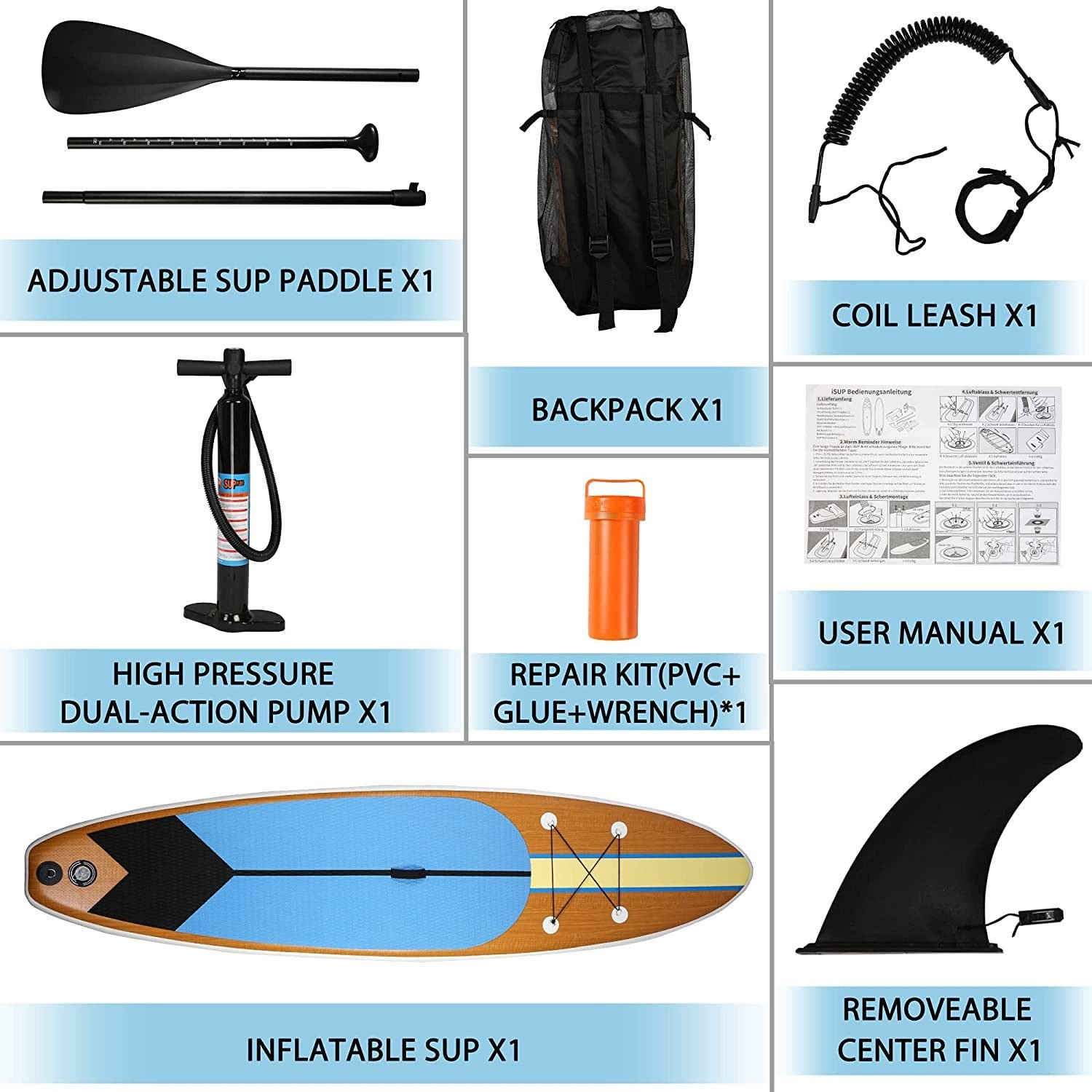 Complete Accessory Package: Inflatable paddle board accessories include 1 Removable Fins ; 2 Way Paddle; Air Pump; Coil Leash; Repair Kit; Black Backpack; our manual air pump is bidirectional; you can easily inflate the paddle board in minutes.