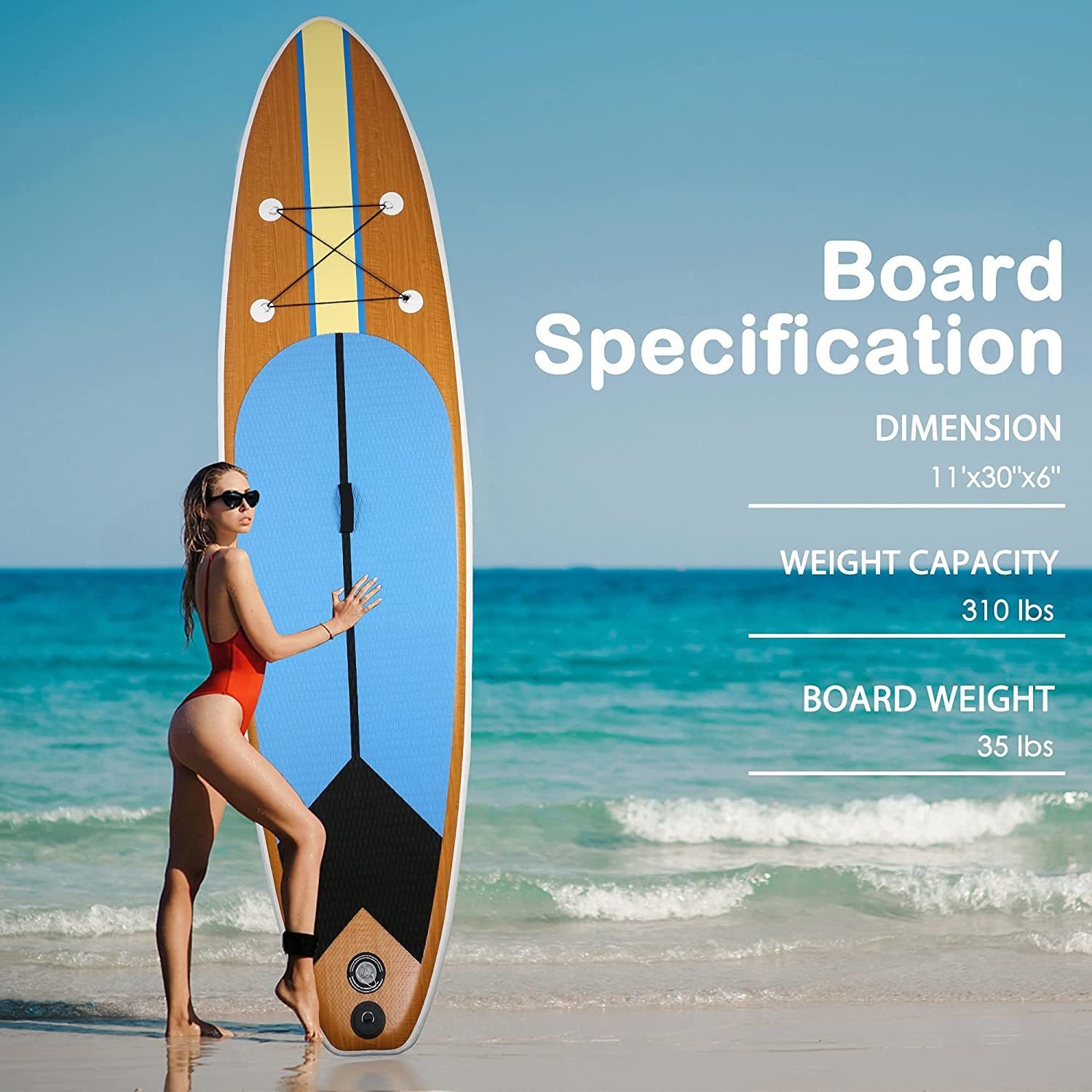 Superior Maneuverabilty: Inflatable stand up paddle board is 11’ long 30" wide 6" thick; weight 35 lbs; detachable bottom panel fin; enhances stability and balance; improve speed; steering and handling.